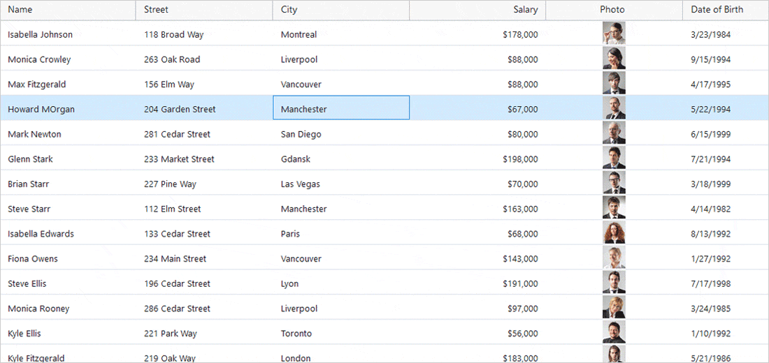Blazor Data Grid에는 SingleCell, SingleRow, MultipleCell, MultipleRow, RangeCell 등의 모드를 포함하여 셀과 행 수준별로 마우스와 터치로 선택할 수 있는 모든 옵션이 포함되어 있습니다.