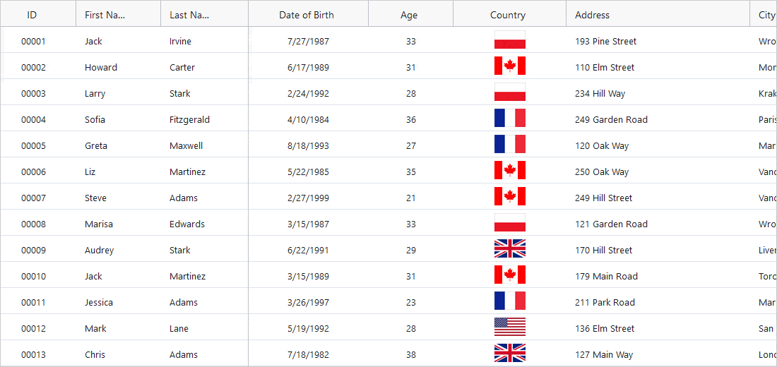 Blazor 데이터 그리드에서 오른쪽 및 왼쪽 열을 고정하면 사용자는 단일 열 또는 여러 열을 임의의 순서로 잠글 수 있으므로 가로로 스크롤하는 동안 열의 위치가 유지됩니다.